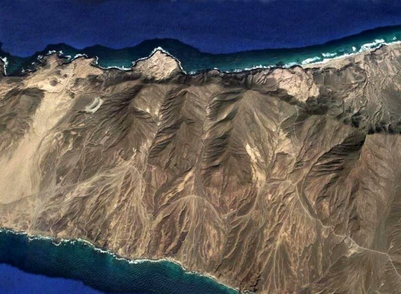 Vergrote satellietopname van een deel van Jándia in het zuiden van Fuerteventura. Zo van boven lijkt het berglandschap veel op een normaal aan verwering onderhevig ketengebergte, met vrij scherpe toppen en diepe ravijnen. Het sterk vertakte patroon van geulen op de flanken van het gebergte duidt op langdurige erosie.