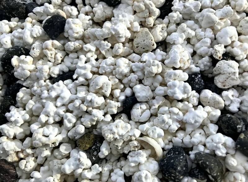 Door de golven worden de kalkfragmenten afgerond en op grootte gesorteerd. Het witte materiaal lijkt sprekend op gepofte maïs.