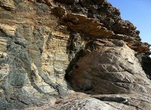 Brokstuk Jura-sediment, afkomstig van Ajuy op Fuerteventura. Uit het sterk gelaagde karakter kan worden opgemaakt dat het hier waarschijnlijk om een turbidietafzetting gaat, die in de Jura-periode door opeenvolgende troebelingsstromen op de bodem van de toen nog zeer prille Atlantische Oceaan boven elkaar zijn afgezet.