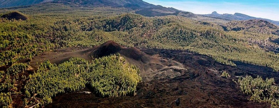 De vulkaan Chinyero vormt omringd door ruwe 'a'a-lava en donkere scoria een zwartbruine, onbegroeide vlek in het beboste landschap. Op de achtergrond is de helling van de Pico Viejo en de Teide zichtbaar.