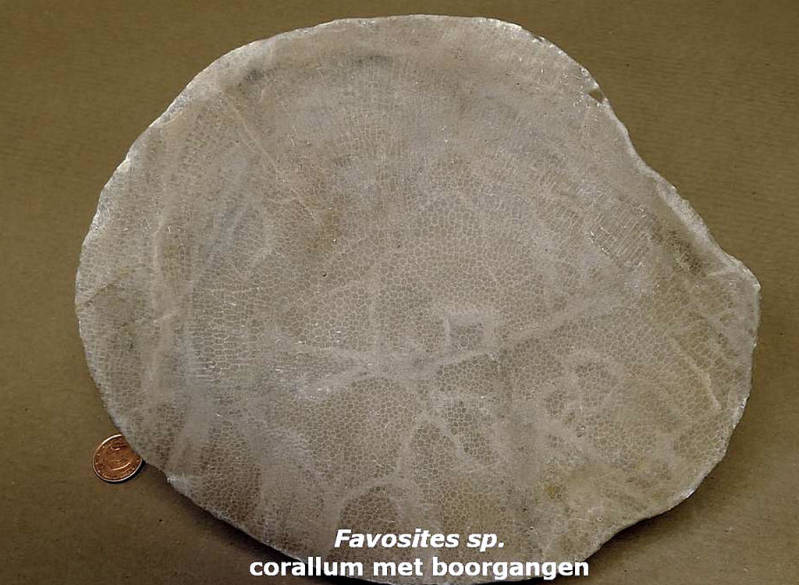 Doorgezaagd exemplaar. De lichtkleurige strepen en vlekken zijn veroorzaakt door borende organismen. De koraalstructuur is op die plaatsen volledig weggeknaagd.