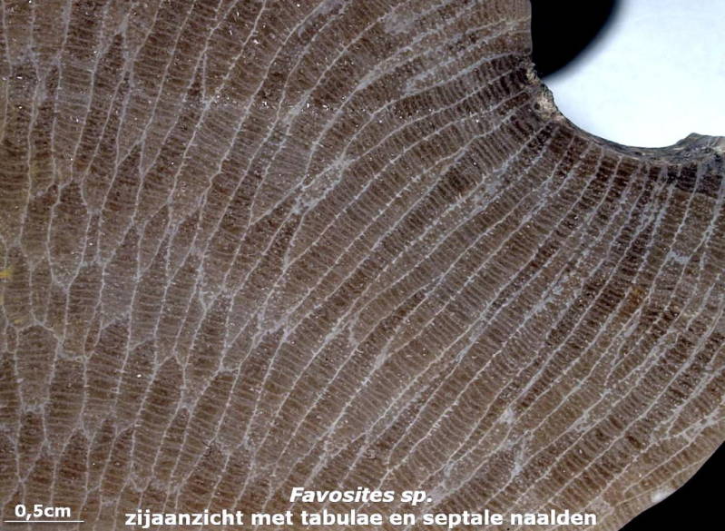 Tabulae zijn bij Favosites meest horizontaal in de corallieten geplaatst. Ook staan ze, meer dan bij Paleofavosites, dichter opeen. De talrijke kleine witte puntjes zijn doorsneden van kalkdoorntjes (septale naalden).