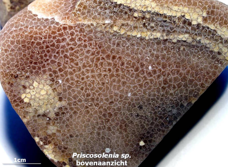 Een prachtige, grotendeels onbeschadigde kolonie, waaraan de typische bijenraatstructuur van de veelhoekige corallieten goed uitkomt. Favosieten worden daarom ook wel 'honingraatkoraal' genoemd.