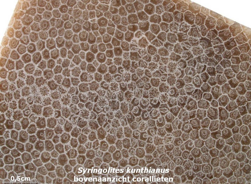 In de met kalk opgevulde corallieten zijn kleine cirkelvormige doorsneden te zien van tubules.