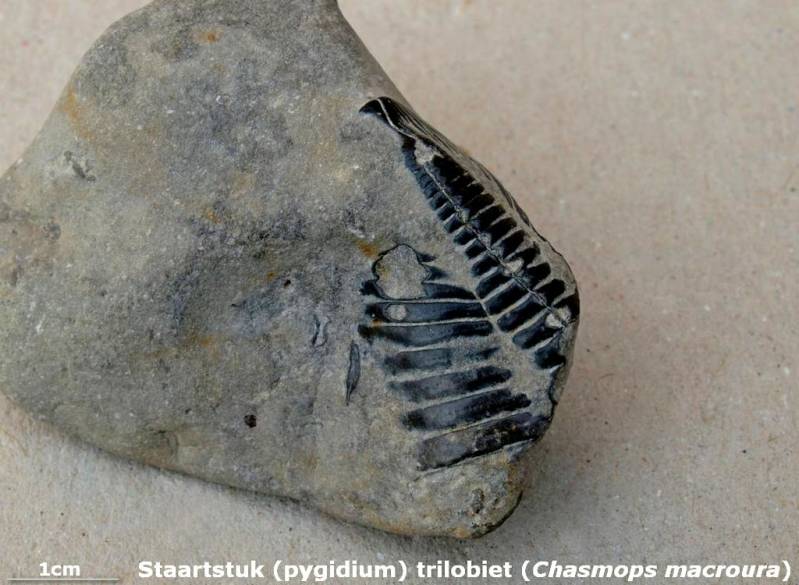 Lavendelblauwe verkiezeling met een pygidium van de trilobiet Phacops (Chasmops) macroura - Zwerfsteen van Alteveer (Gr.)