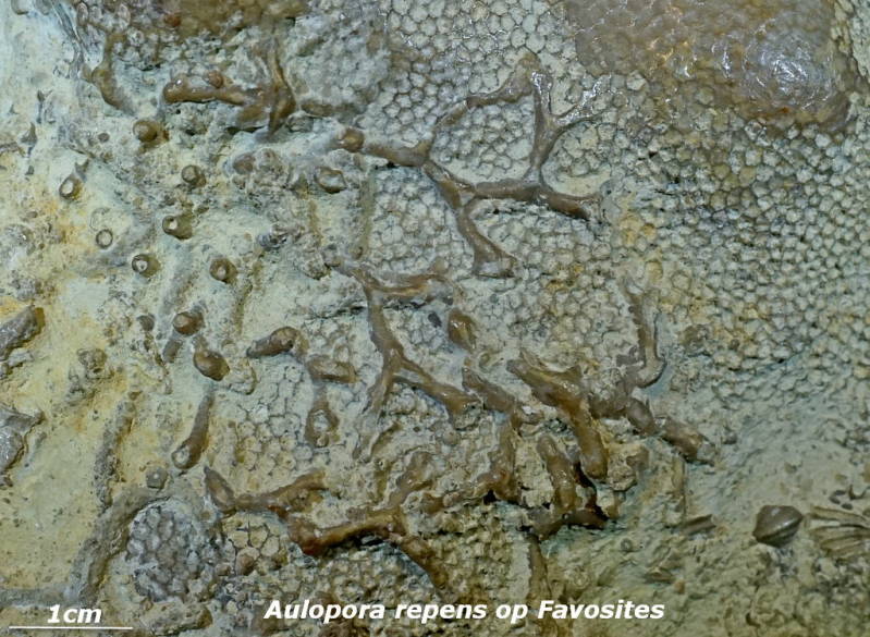 Aulopora repens op Favosites sp. - Zwerfsteen van Haren (Dr.)