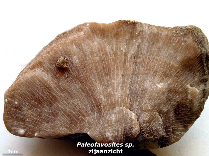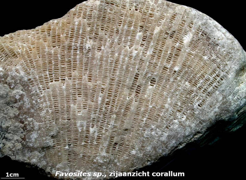 Overlangse doorsnede van het corallum. De slanke koraalbuisjes zijn onderverdeeld door dwarsgeplaatste tabulae. Aan de wijze waarop de corallieten uitwaaieren is te zien dat deze favosiet oorspronkelijke halfbolvormig was.
