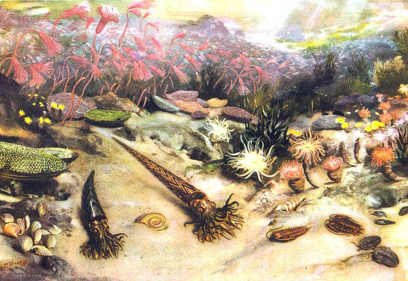 Reconstructie van de zeebodem in een ondiepe Silurische zee. Op de voorgrond kreeftachtige trilobieten en een tweetal nautilusachtigen (orthoceren). De platronde vormen op de zeebodem zijn tabulaten met links vooral rugose koralen. De 'bloemen op steel' op de achtergrond zijn zeelelies.