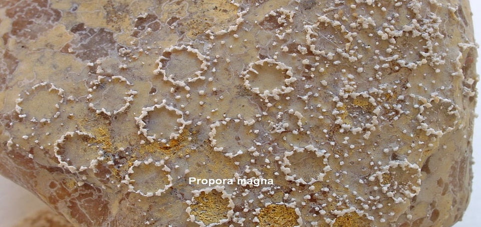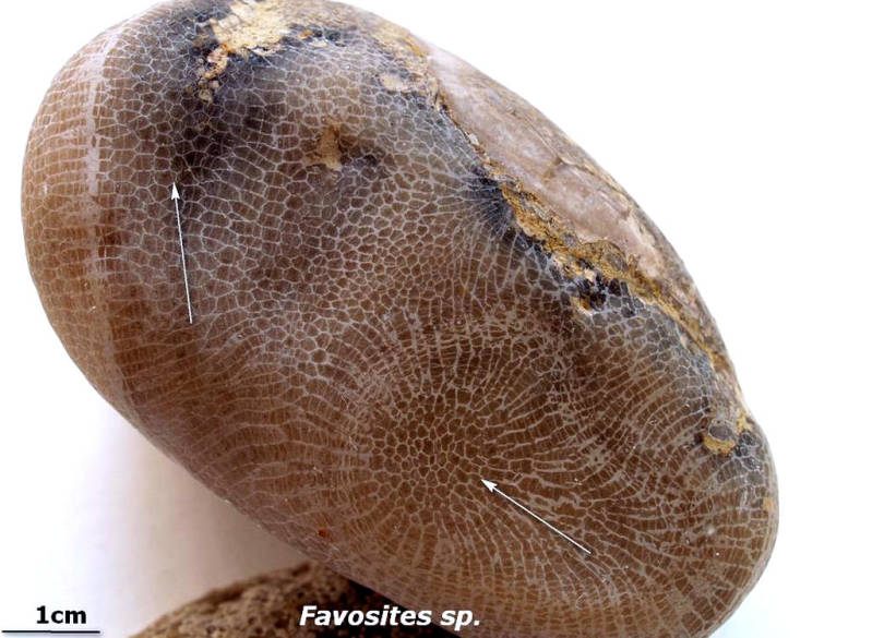 Hoewel het afgebeelde fossiel een afgesleten fragment is van een koraalkolonie, zou microscopisch onderzoek uitwijzen dat we met twee verschillende soorten te maken hebben. De corallietdoorsneden bij de pijlen verschillen niet alleen in grootte, ook de vorm ervan is verschillend. Die bij de pijl rechtsonder hebben een zgn. thamnoporoïd karakter.