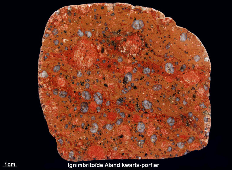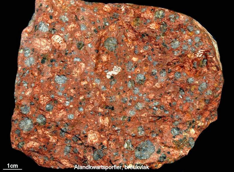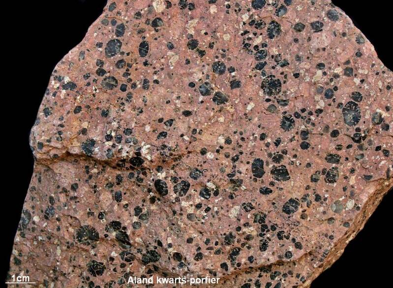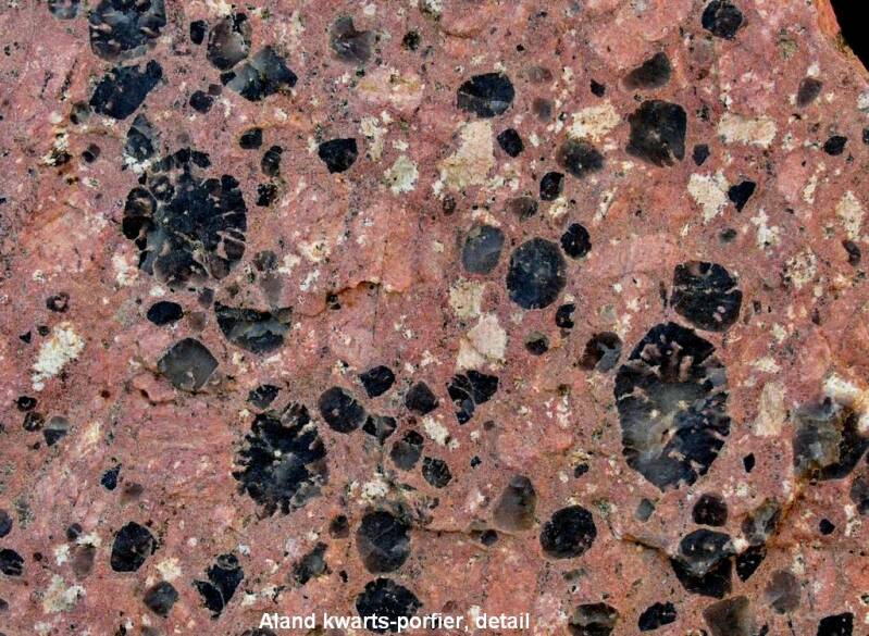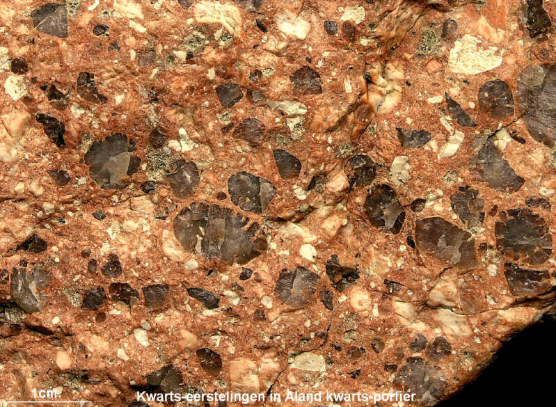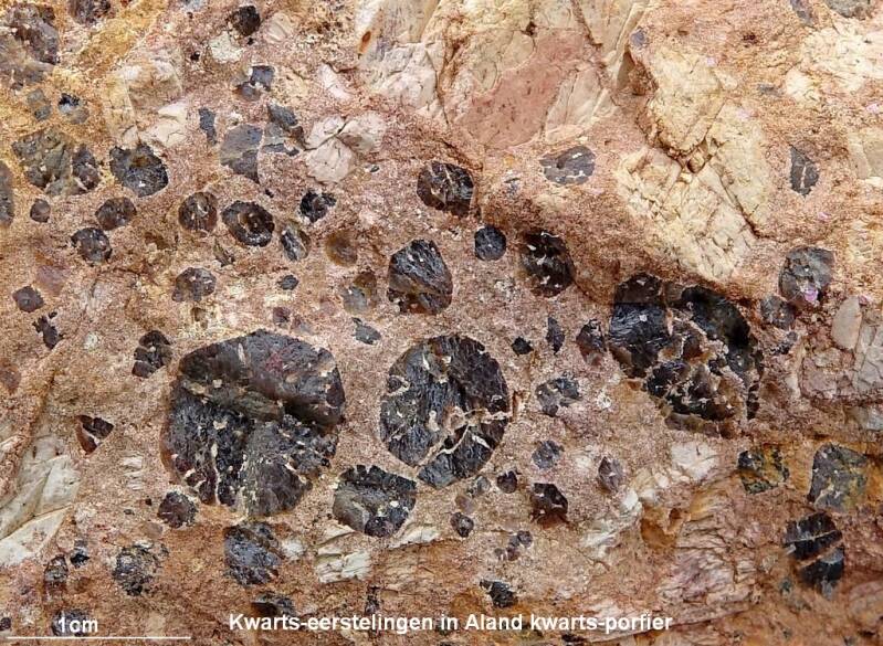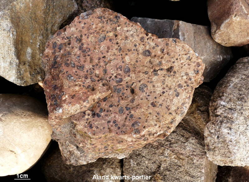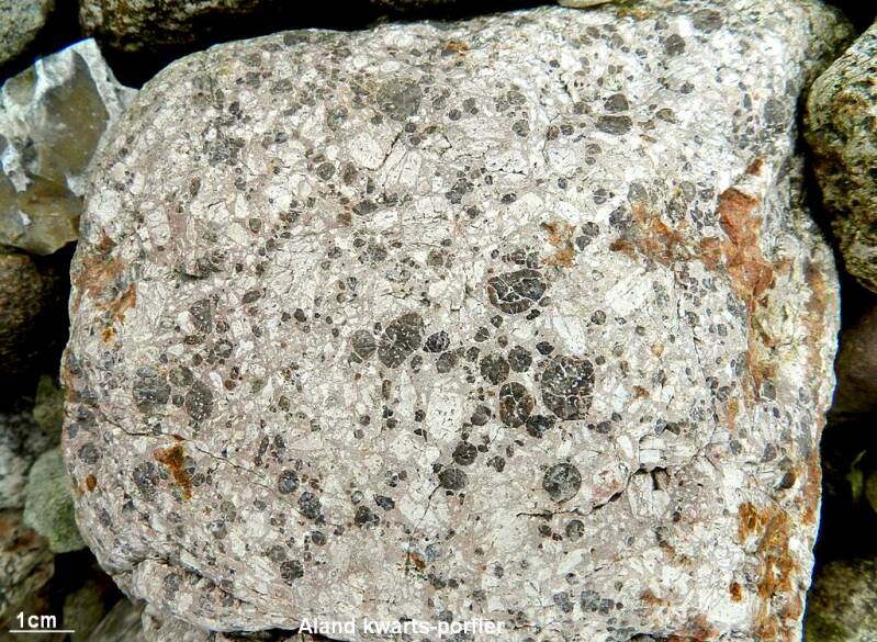 Licht verweerde Aland kwarts-porfier is een fraai, makkelijk herkenbaar gesteente. De donkergrijze radiaal gespleten kwartsen steken duidelijk tegen de lichtrode grondmassa af.