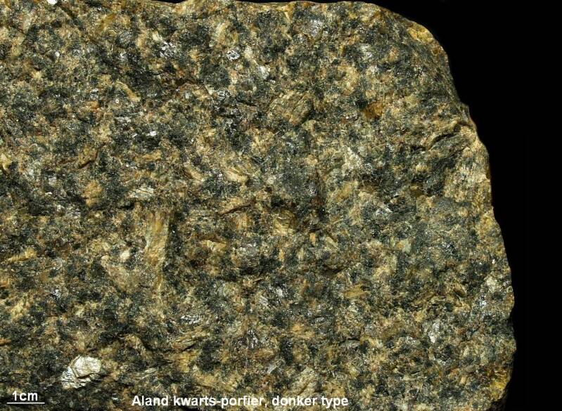 Somber gekleurd, maar onmiskenbaar een Aland kwarts-porfier. De buitenzijde van deze nauwelijks verweerde zwerfsteen is vuil geelbruin grijs. Opvallend zijn de ronde sterk gecorrodeerde ronde kwartsen. Daarnaast komen veel scherfvormige geelachtig witte kristalfragmenten voor van plagioklaas.