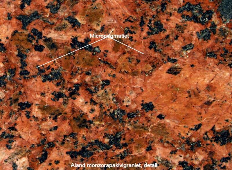 Aland monzo-graniet wordt wel als 'randfacies van rapakivigraniet' aangeduid. Wat iemand zich daarbij moet voorstellen? Het zijn kleinkorrelige, homogene en vooral somber uitziende roodachtige granieten. Aan de buitenzijde zijn het doorgaans weinig zeggende gesteenten. Soms is het uiterlijk iets sprekender door talrijke kleine witte plagioklaaskristallen in een onduidelijke grondmassa van roodachtige kaliveldspaat, zeer fijn verdeelde kwarts en veel donkere mineralen.