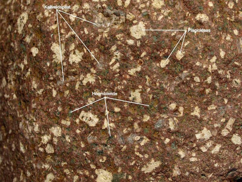 De samenstellende mineralen zijn met lijnen aangegeven. Kwarts is macroscopisch nagenoeg niet zichtbaar. Eerstelingen van dit mineraal ontbreken. Kaliveldspaat-eerstelingen zijn grijsrood van kleur en worden maximaal 1cm groot.