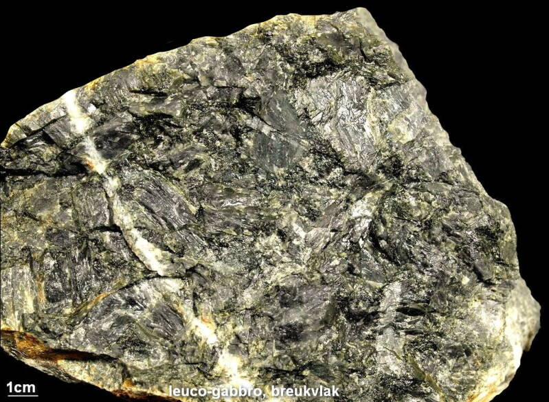 Leuco-gabbro's bevatten tussen 10 en 35 % donkere mineralen. Het grijswitte mineraal is basische (calciumrijke) plagioklaas.