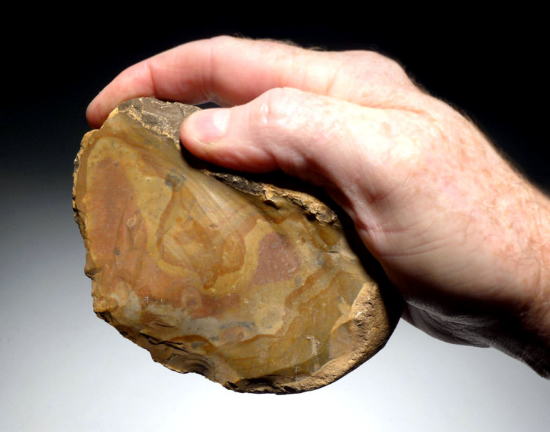 Aan de oevers van het Turkana-meer in Kenia werden behalve deze primitieve vuistbijl meer dan honderd andere werktuigen, waaronder aambeelden en schaven opgegraven.