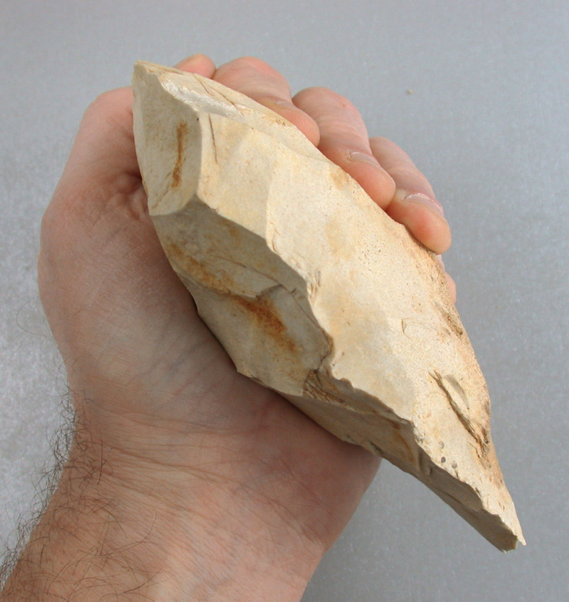 Vuistbijlen worden beschouwd als werktuigen waar veel werkzaamheden mee verricht werden. De moeilijkheid is dat men simpelweg niet weet welke werkzaamheden. Voor een deel komt dit door talrijke vondsten van vuistbijlen die geen spoor van gebruik tonen. De foto toont een grote vuistbijl met zijn scherpe snijrand. De vuistbijl is gevonden bij Jaure, Bergerac in Frankrijk.