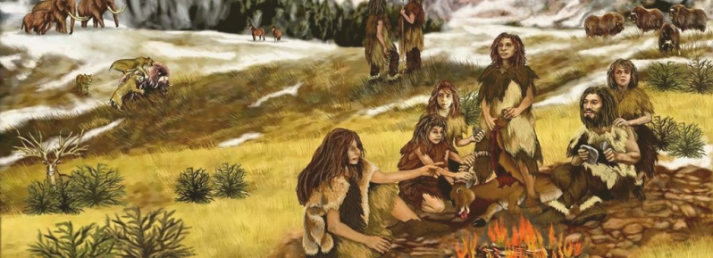 Een groep Neanderthalers met jachtbuit. Neanderthalermensen waren nooit erg talrijk. Ze trokken ook niet in grote groepen rond, voor zover bekend deden ze dit in familieverband.