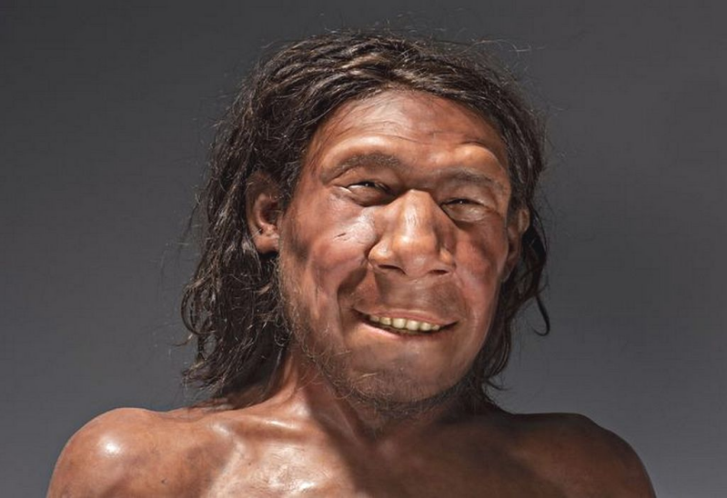 Reconstructie van een Neanderthalerman. Het gezicht is wat grof gebouwd, wat vooral veroorzaakt wordt door de vooruitstekende wenkbrauwbogen boven de ogen. Over de beharing van Neanderthalers bestaat veel onduidelijkheid. Ze waren aangepast aan koude klimaatomstandigheden. Mogelijk hadden ze daardoor ook een zware lichaamsbeharing.