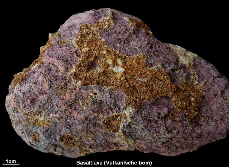 De steen heeft de typische paars-rode kleur van verweerde vesiculaire basalt zoals deze in de vulkanische Eifel in Duitsland veel voorkomen. Uit de vorm van de steen en aan de inwendige vesiculaire structuur valt af te leiden dat we hier hoogstwaarschijnlijk met een vulkanische bom te doen hebben.