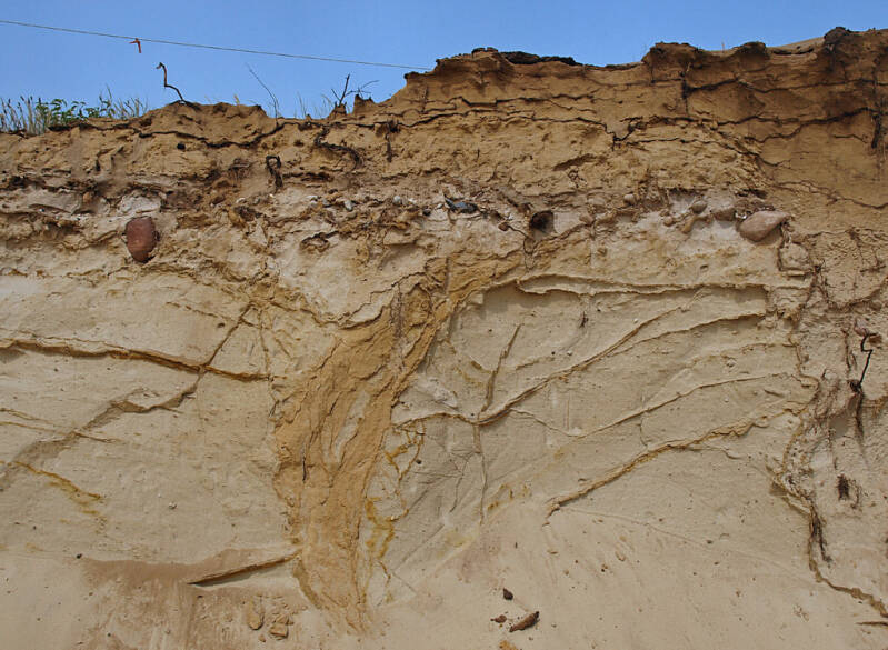 De lichtkleurige, meest verticaal verlopende strepen en vlekken zijn fossiele graafgangen van mestkevers.
