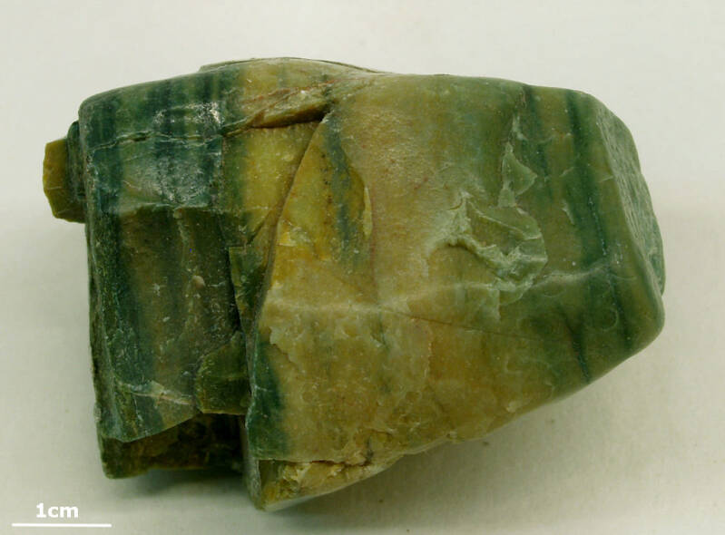 Dit type toont talrijke parallel verlopende, donkerder getinte strepen (fiamme) naast deels geresorbeerde, bruinzwarte fragmenten basisch gesteente.