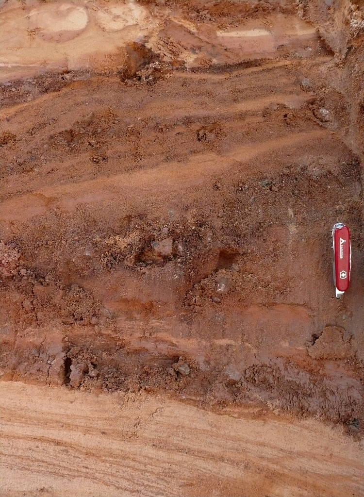 In delen van de grootste aangesneden zandlens was scheve gelaagdheid zichtbaar. Boven en onder deze secties is het zand fijnkorreliger. In het midden van de foto, direct boven de scheve gelaagdheid, zijn enigszins vervormde golfribbelstructuren zichtbaar.