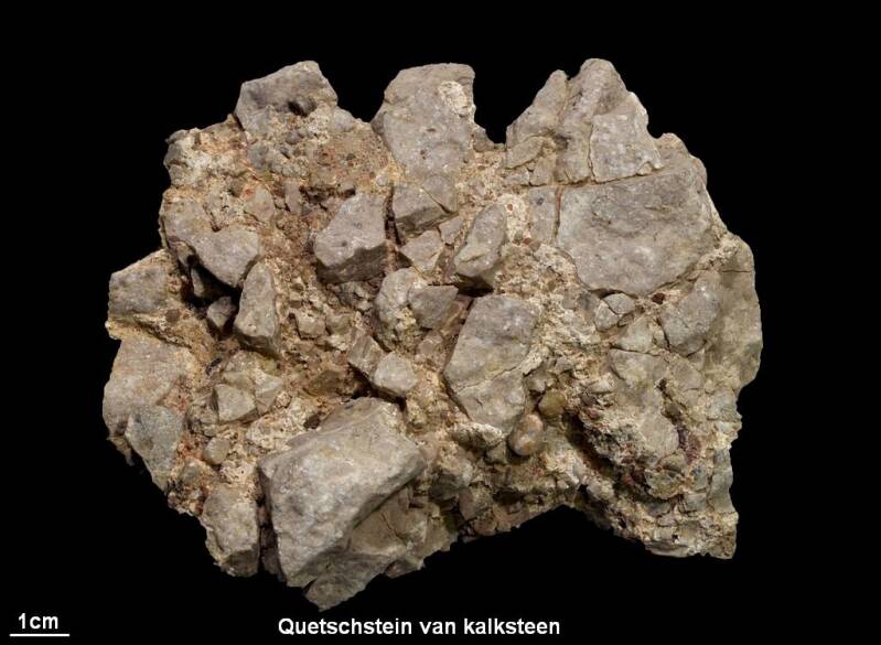 Op verschillende plaatsen zijn lagen met opeengepakte zwerfstenen, die in afwisseling met smeltwaterzanden en slierten keileem in Nieuweschoot-keileem aanwezig zijn, secundair door kalk verkit tot keihard conglomeraat. Dit fragment is afkomstig van een randgedeelte van een metersdikke keienpakking, die met pneumatische hamers 'weggegraven' moest worden.