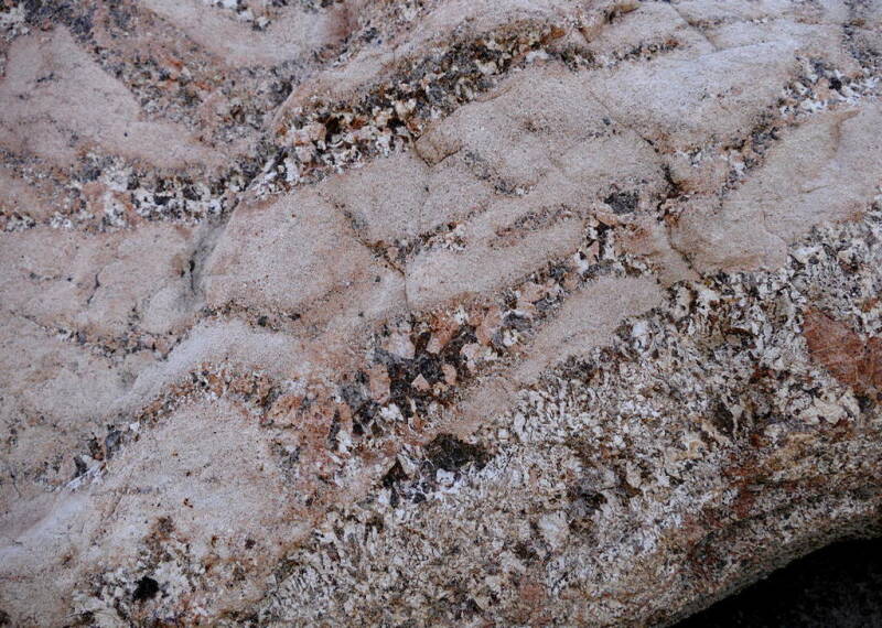Detail van de steen hiernaast, waarin de grillige afwisseling van apliet en pegmatietische delen duidelijk naar voren treedt.