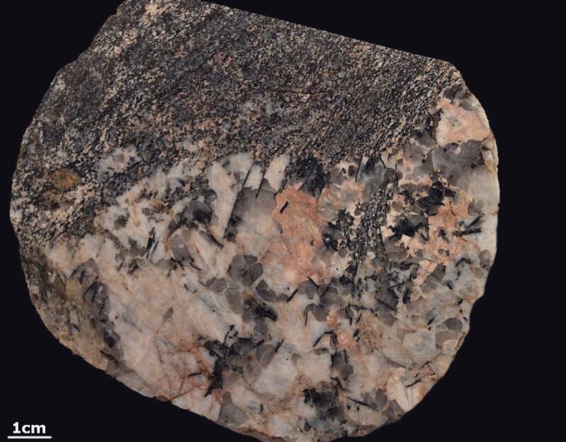 De overgang tussen gneis en neosoom wordt gemarkeerd door een smalle donkere zone (=melanosoom)