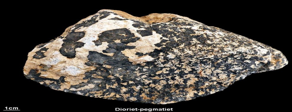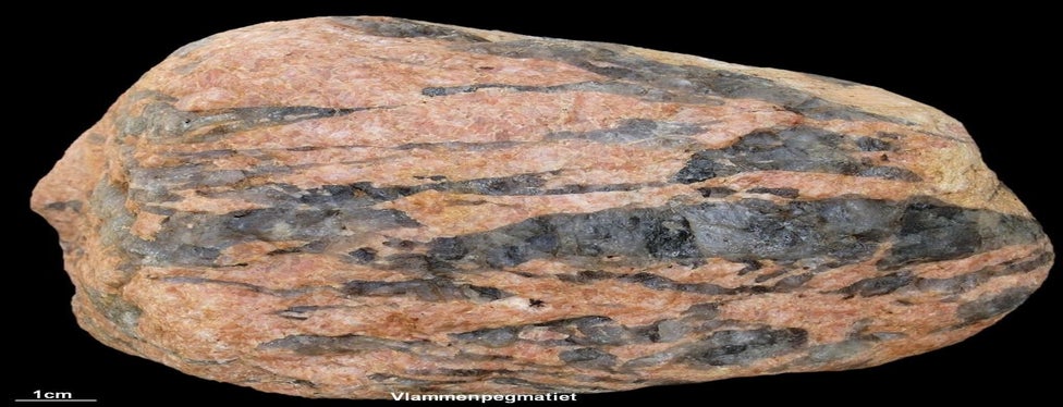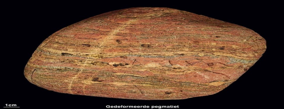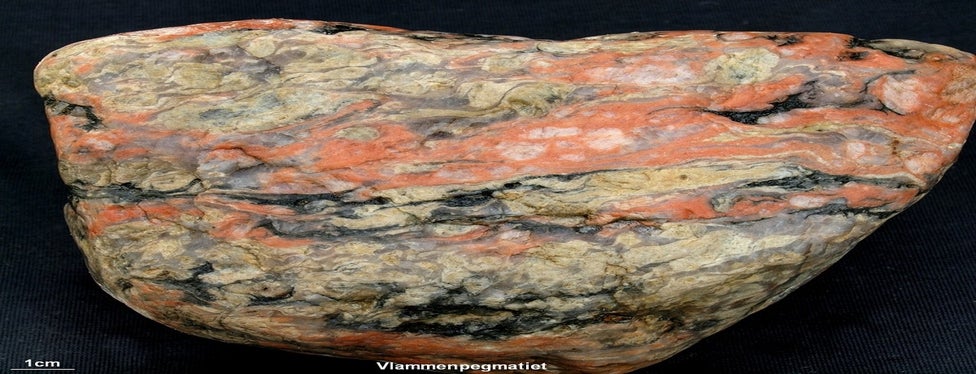 De steen op de foto is een gneis, maar is ontstaan uit pegmatiet. Het is zelfs een gidsgesteente, sowieso een wonder bij metamorfe gesteenten.