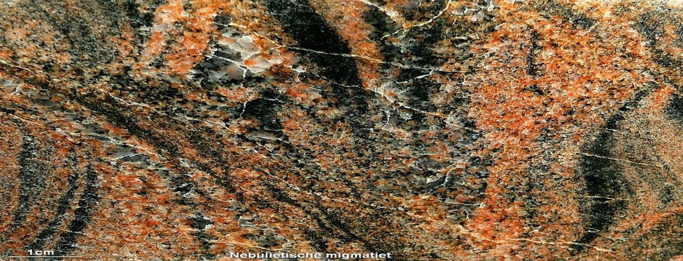 Het oude iets donkerder, biotie-trijkere gneisgedeelte (paleosoom) onderscheidt zich goed van de nieuwgevormde, grofkorreliger vegen en banden van graniet (neosoom). In neosomen tonen de rode granaten vaak hun eigen vorm. De kristallen zijn in dat geval idiomorf. Daarbuiten vormen ze meestal onregelmatige aggregaten. Soms zijn de granaten omgeven door een heel smalle zoom van biotiet.