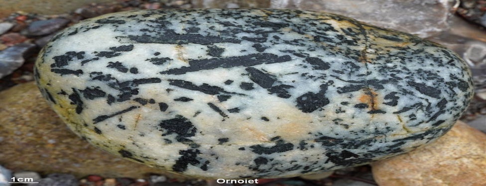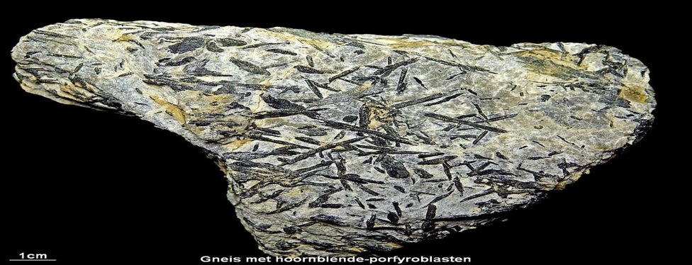 Toch kunnen grijswitte stenen behalve interessant toch ook erg mooi zijn. Neem deze gneis met zwarte hoornblendenaalden. Gneis zult u denken? Ja, echt, alleen anders gneis dan de meeste. Van de zijkant gezien valt het gestreepte karakter van de steen wel op. Van dichtbij is de grondmassa een borstplaatachtige massa van kwarts en veldspaat. De zwarte naalden zijn porfyroblasten van hoornblende. Deze contrasteren bijzonder fraai met de lichtkleurige grondmassa.