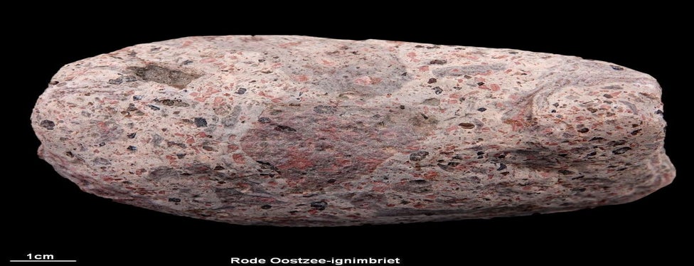 In het Noorse Oslogebied waren in het Vroeg-Perm nog heviger uitbarstingen. Het gloeiend hete materiaal dat uit deze gloedwolken werd afgezet, versinterde door de hoge temperatuur tot een harde ignimbriet. Veel van onze kwarts-porfieren zijn op deze wijze ontstaan. Bordvika-ignimbriet is er een van. Foto en verzameling: Hans van Essen - Dieren.