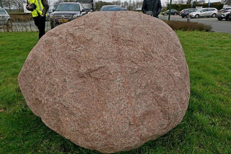 De bijna 6 ton zware Aland-rapakivi, met aan de voorzijde een roder deel. Dit is een vlak aangesneden breukzone, waar het gesteente door hematiet intensiever roder van kleur is.