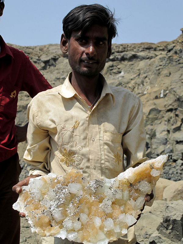 De kristalgroepen worden over de hele wereld verkocht. Op de foto een zeer grote mineraalgroep met stilbiet (geelbruin) en apophylliet (wit).
