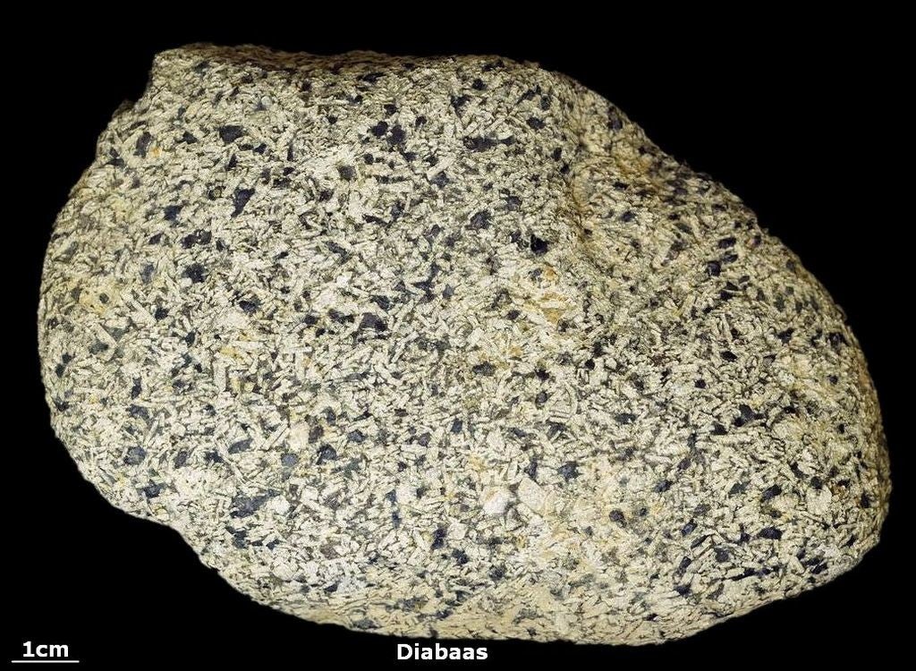 Dit is één van de mooiste diabaas-typen die als zwerfsteen te vinden is. Vooral de meer grofkorrelige typen tonen de karakteristieke hakerige (=ofietisch) structuur van diabaas op zijn mooist.