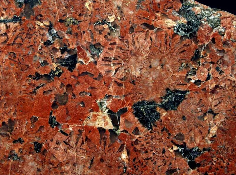De kwarts-veldspaatvergroeiingen vormen duidelijke radiaalstralige 'zonnen'. Naar buiten toe neemt de grofte van de vergroeiing toe