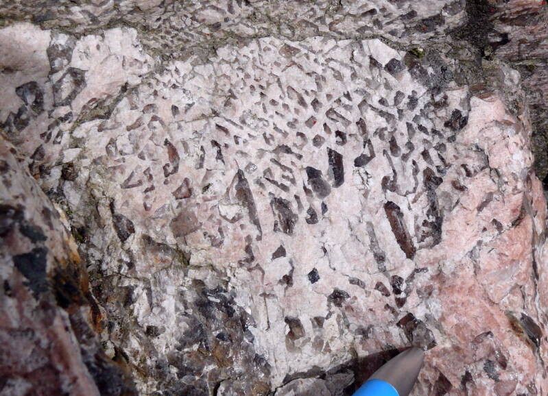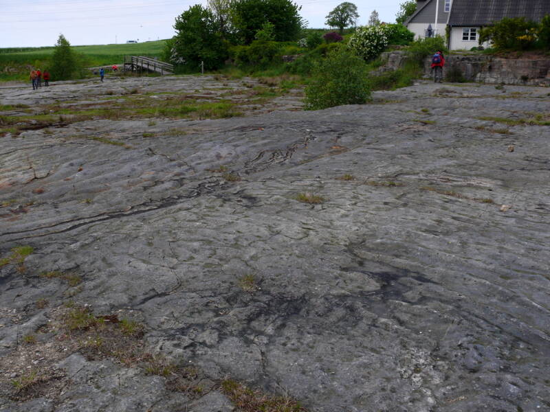 Het rotsoppervlak bij Museum Natur Bornholm, zuidelijk van Akirkeby, bestaat voor een belangrijk deel uit pegmatiet met schriftgraniet.