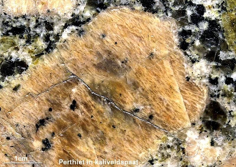 De fijne adering in de kaliveldspaat bestasat uit lichtkleurige, ietwat onregelmatig verlopende lamellen van albiet/oligoklaas. Dit zijn twee natriumrijke plagioklaas-soorten.
