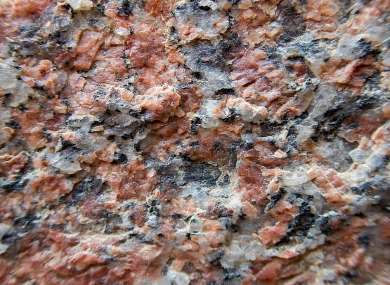 Verweringsoppervlak van deze graniet. Het witte mineraal is plagioklaas. Het kleurige, rozerode bestanddeel is kaliveldspaat . Kaliveldspaat vormt verspreid in het gesteente enigszins onregelmatig begrensde, tabletvormige eerstelingen. Het zwarte bestanddeel is biotiet vergezeld van hoornblende.