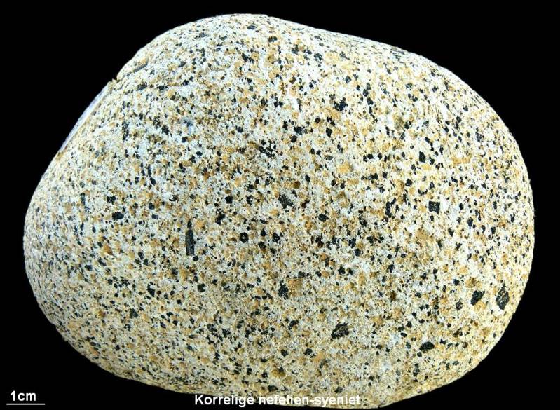 In zijn westelijke verbreidingsgebied in Zuid-Noorwegen bevat Larvikiet geen kwarts meer. Hiervoor in de plaats is enige nefelien aanwezig. In de zwerfsteen op de foto is dit mineraal te herkennen aan de gelige vlekjes en putjes in het verweerde oppervlak.