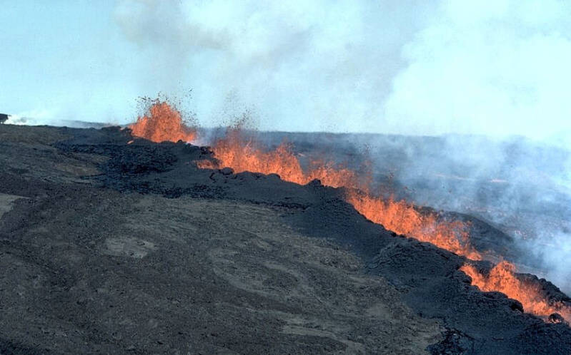 Door de dunvloeibaarheid van de lava kan opgelost gas makkelijk ontwijken. Erupties als hierboven leveren een fantastisch schouwspel op van soms kilometers lange, vurige lava-fonteinen, waarbij lava tientallen tot enige honderden meters omhoog geworpen wordt. Zo ongeveer moeten we ons ook het uitvloeien van rhombenporfiermagma in het Oslo-gebied in de Perm-periode voorstellen.