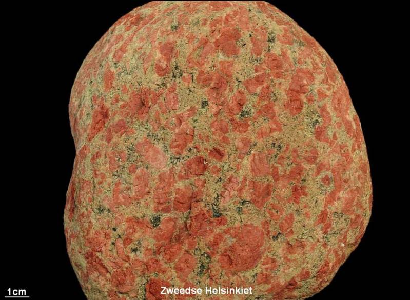 De roodachte kleur van kaliveldspaat in Zweedse Helsinkiet varieert. Ook het percentage groene epidoot wisselt.