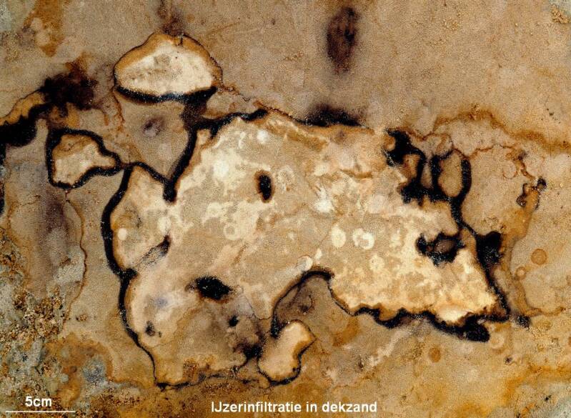 IJzeroxide kan zand diep bruinzwart kleuren. De lichte vlekken in het zand kunnen door bacteriën zijn ontstaan.