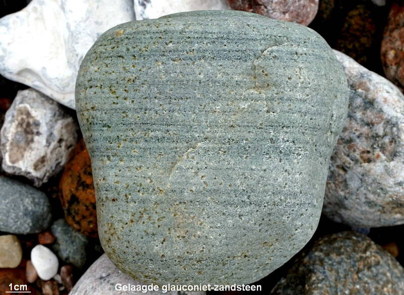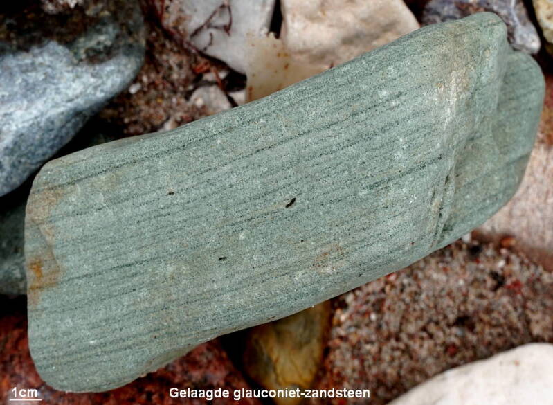 Glauconiet-zandsteen is duidelijk gelaagd. Laagjes rijker aan glauconiet tekenen zich door een iets donkerder kleur duidelijk in het gesteente af.