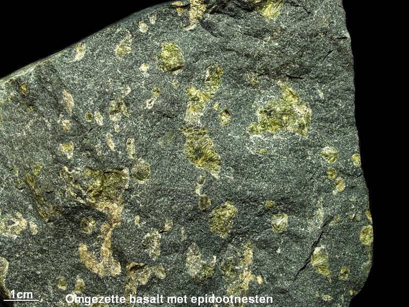 Basische gesteenten als basalt en diabaas veranderen in de loop van de tijd doordat er mineralogische omzettingen plaats vinden. Door de vorming van chloriet en epidoot kleuren deze gesteenten vaak groenzwart tot grijsgroen. In de ooit aanwezige gasholtes van de steen op de foto heeft zich kristallijne epidoot afgezet.
