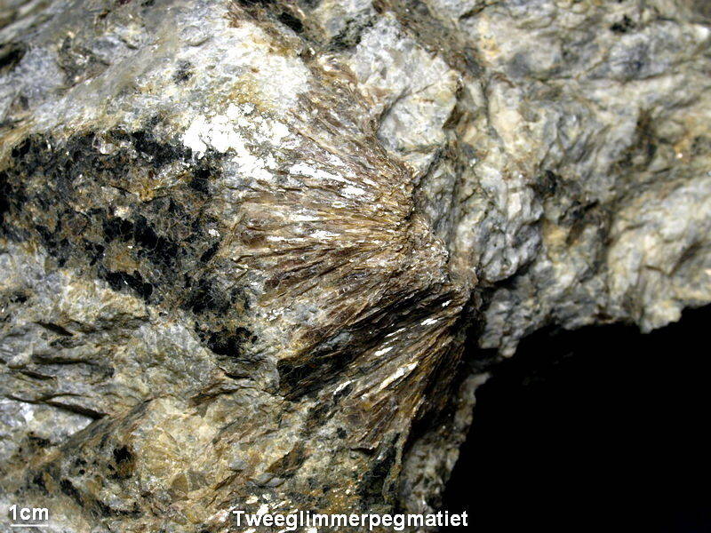 Zwarte biotiet vormt vlakke donkere aggregaten, in tegenstelling tot de zilverwitte muscoviet. Dit mineraal vormt op de foto een fraai radiar uitwaaierend aggregaat te midden van wittte kaliveldspaat.