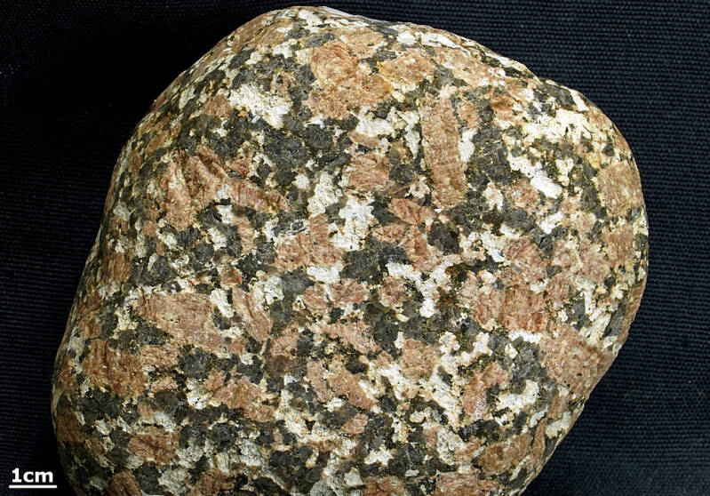 Aan de buitenzijde is deze graniet te herkennen aan zijn grootkorrelige, porfierische structuur, vergezeld van bruinrode plagioklaas.