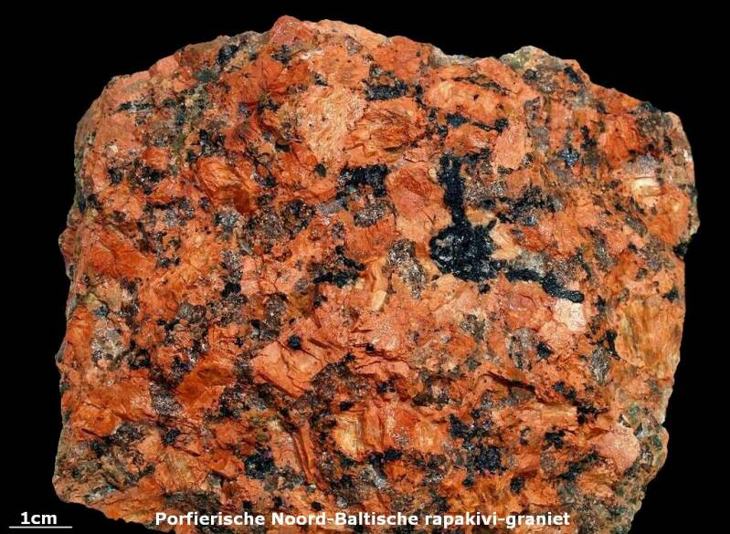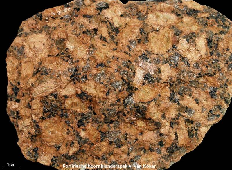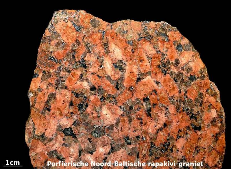 De afgebeelde steen is de zwak-porfierische variant van de hierboven besproken Porfierische rapakivi-graniet.