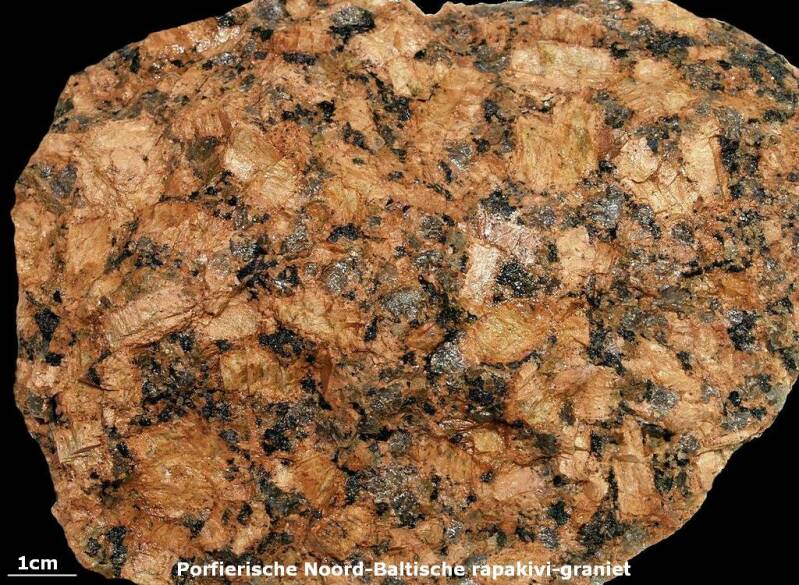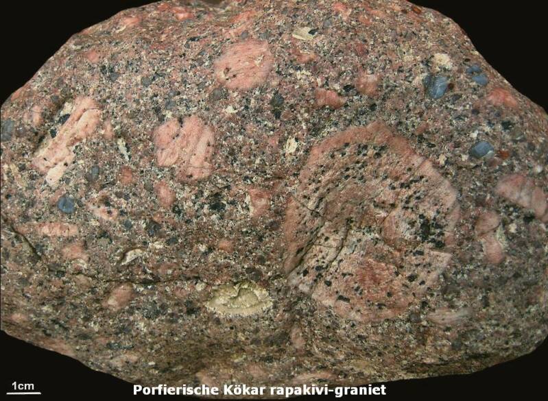 Deze onregelmatig gevlekte kaliveldspaat-eerstelingen zijn karakteristiek voor Noord-Baltische rapakivi-graniet.